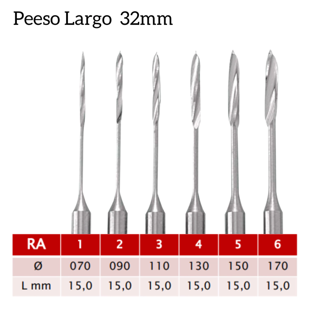 As Brocas Peeso Largo são projetadas para proporcionar ampliação segura e eficiente do canal radicular, facilitando o acesso para pinos intrarradiculares e remoção de material obturador. Fabricadas em aço inoxidável de alta qualidade, garantem resistência, precisão e baixo risco de fratura.